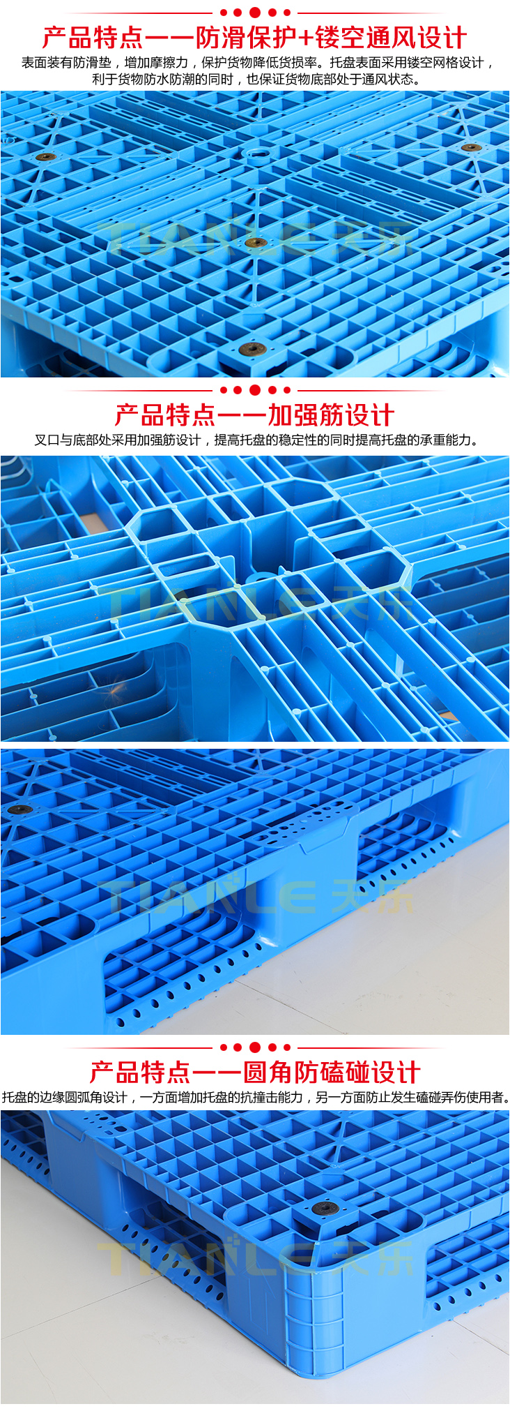 山东天乐塑料科技有限公司,主要生产塑料托盘,塑料周转筐,塑料垃圾桶,销售木包装箱木托盘,胶合板托盘,产品使用于汽车、食品、医药、造纸、印刷、电子、电器、化工、纺织、服装、仓储物流、环卫等行业。产品多规格全价格实惠,大厂家售后保障体系完善。产品品种,以载重量分类,包括:一次 使用的特轻型、轻型、标准型、货架加重型等适用范围:食品医药化工纺织汽配厂等行业仓储物流运输用